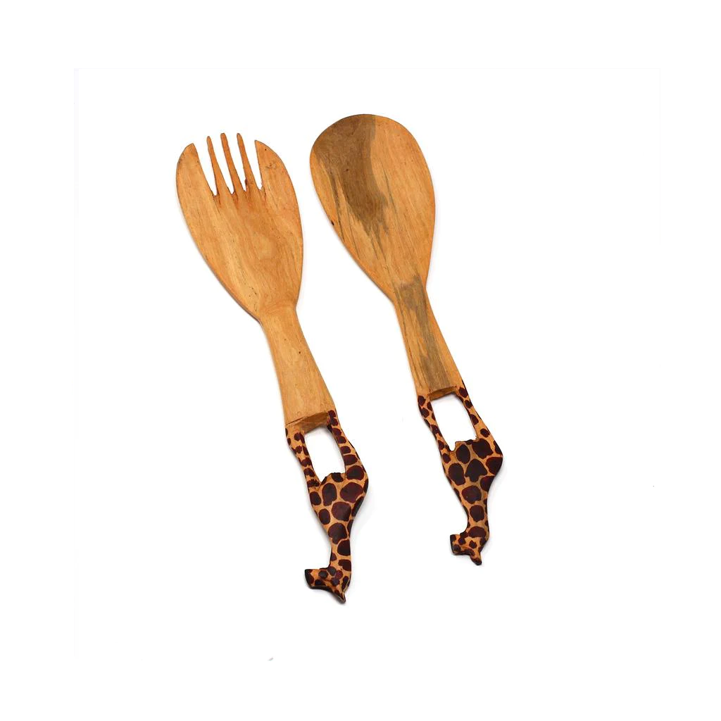Artfully carved from a single piece of renewable mhugu wood using simple hand tools, this rustic pair of wooden salad servers showcase the talents of the Kenyan artisans in designing an animal silhouette in the handle. Each piece is approximately 11 to 12-inches in length.