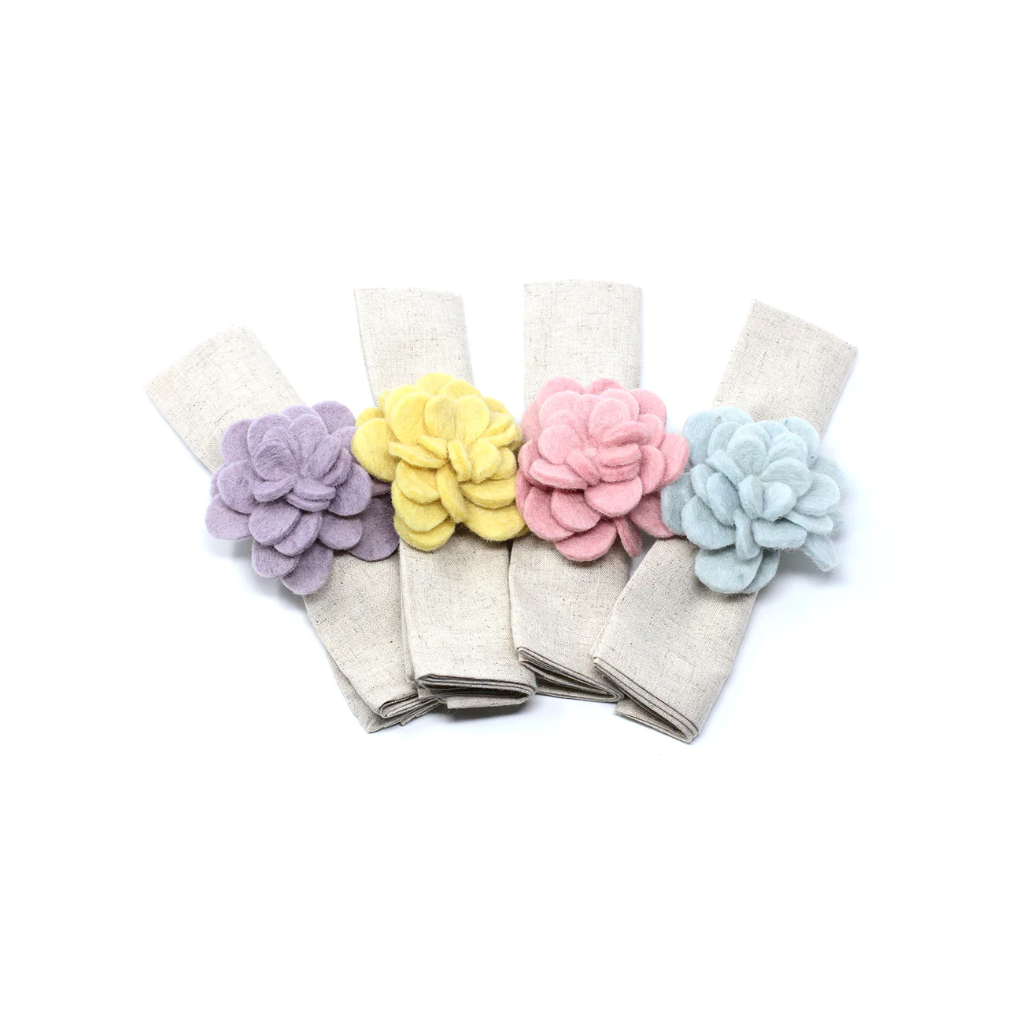 These felted napkins rings are sure to bring some color and fun to your dinner table. Flower measures 4 inches diameter with a 2 inch ring; 4 pack only, colors as shown. Handmade in Nepal.