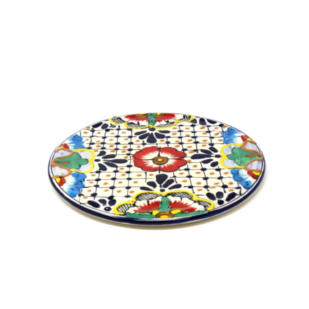 This traditional Mexican pottery is crafted and hand painted by artisans in Mexican using traditional pottery technique. Each piece is highly textured and unique -- these pieces are gorgeous, yet very functional. This piece is a functional hot plate/trivet or a beautiful wall decoration (hole on the back for hanging).