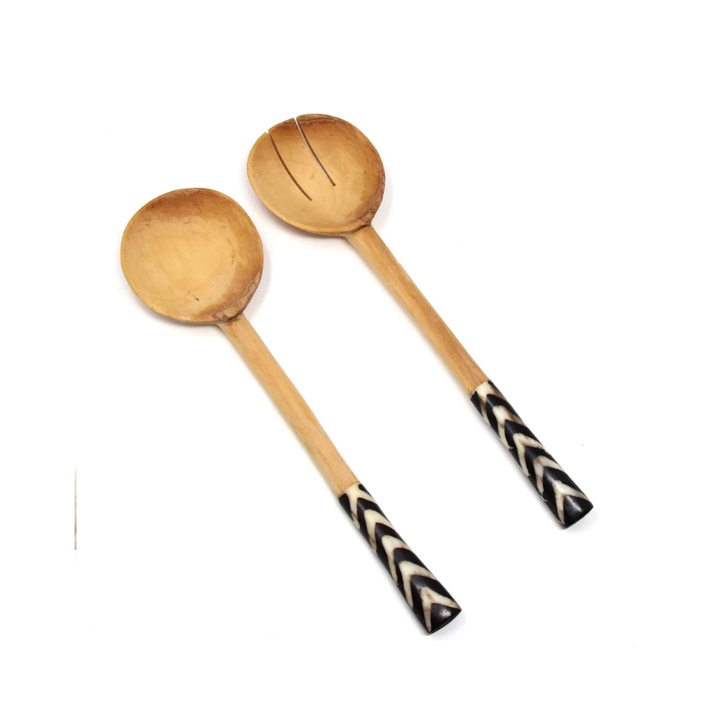 Artfully carved from a single piece of wild olive wood using simple hand tools, this rustic pair of wooden salad servers showcase the beautiful natural wood-grain, contrasted by handles featuring traditional batik African art. The server handles are from highly polished and sanitized cow bone, sourced from natural causes.