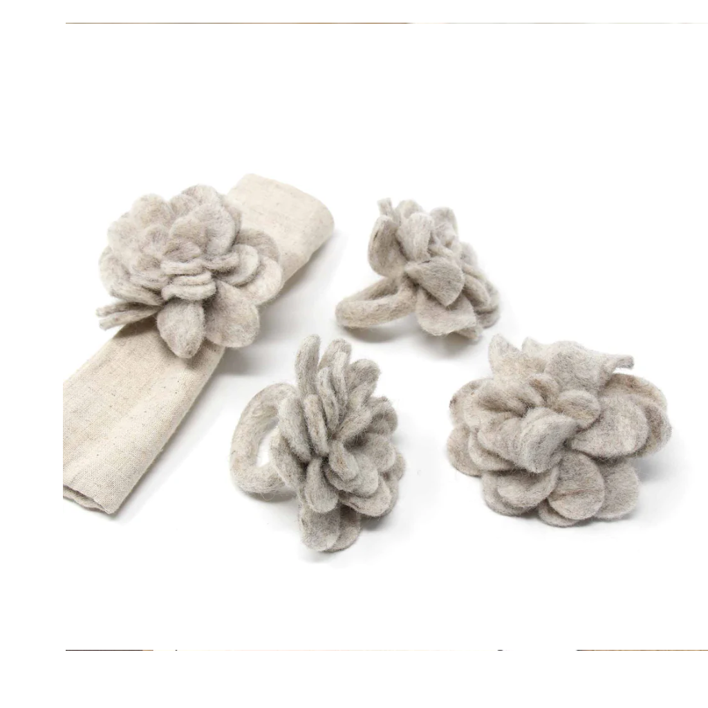 These felted napkins rings are sure to bring some color and fun to your dinner table. Flower measures 4 inches diameter with a 2 inch ring. Handmade in Nepal.