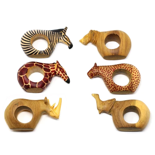 Add a unique look to your dinner table with this set of six handmade safari animal napkin rings. This set of six napkin rings is carved from African Mahogany, using simple tools and traditional techniques handed down through the generations of Kenyan artisans.